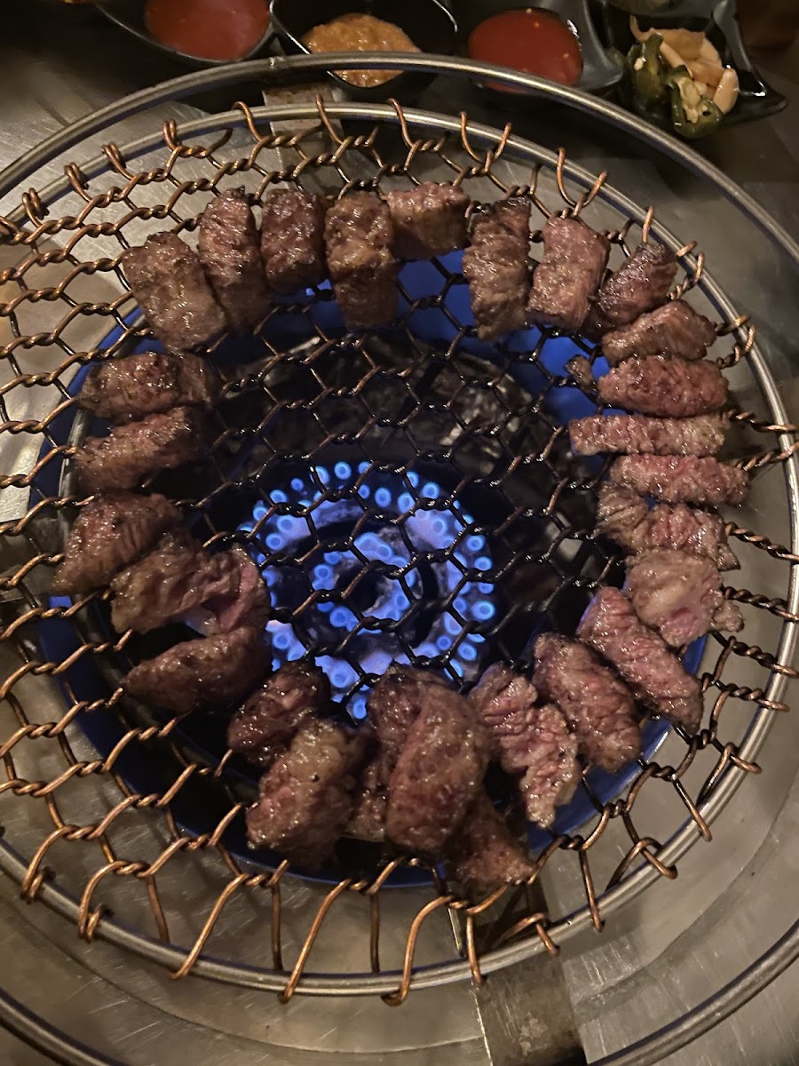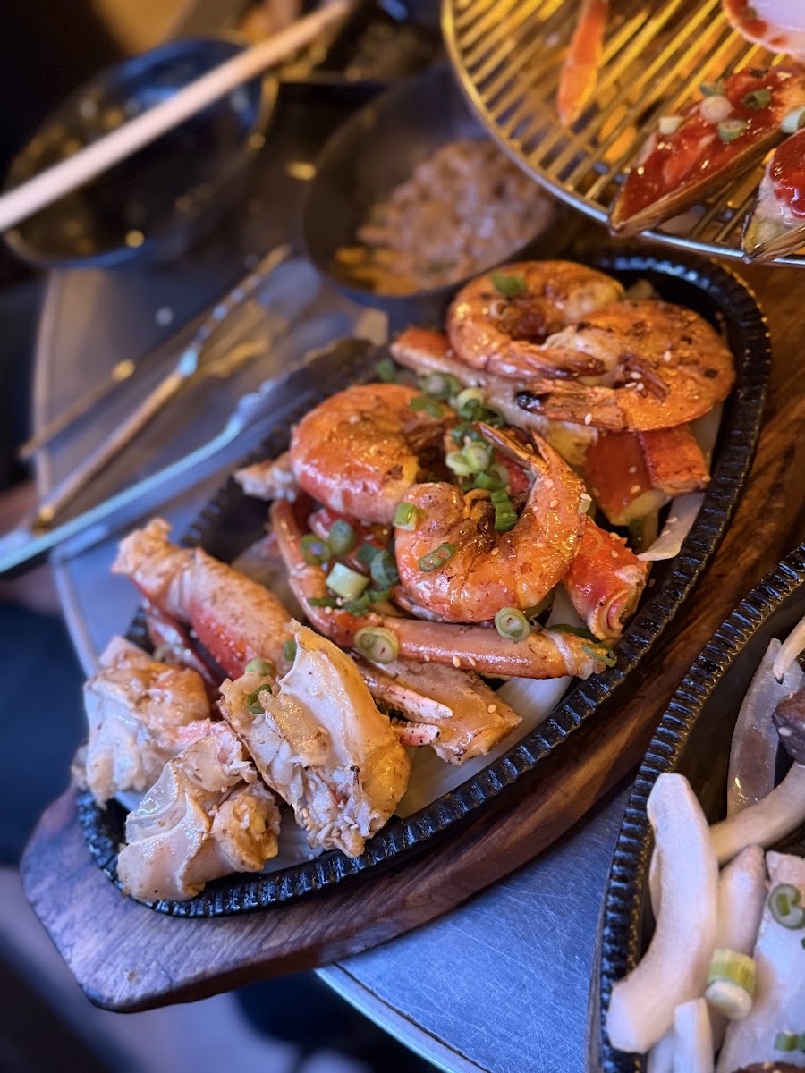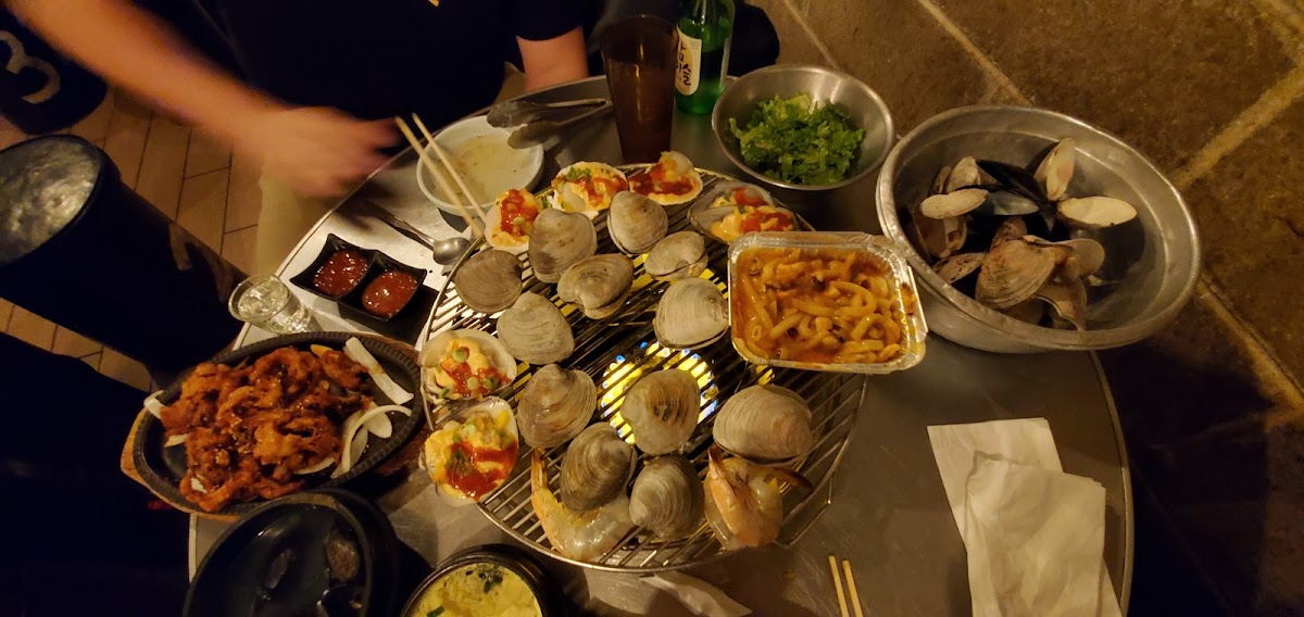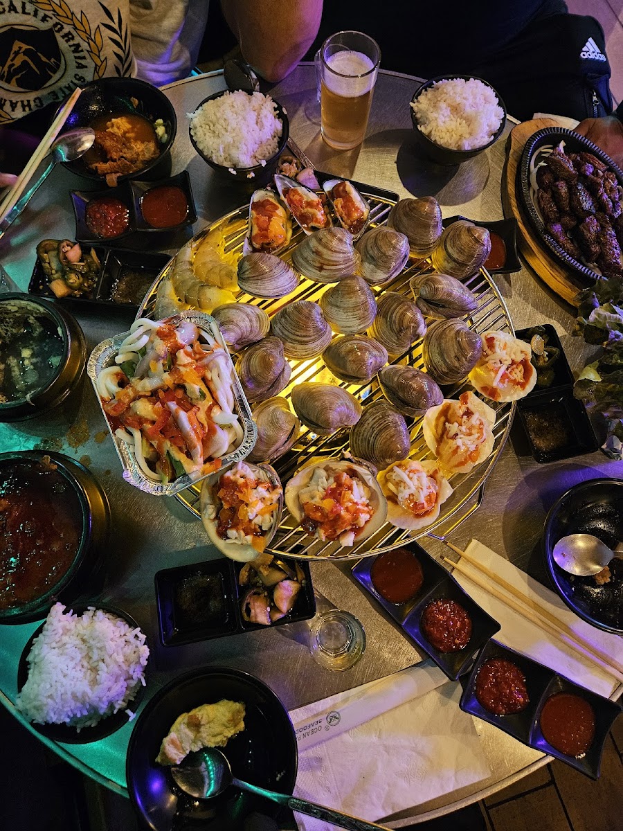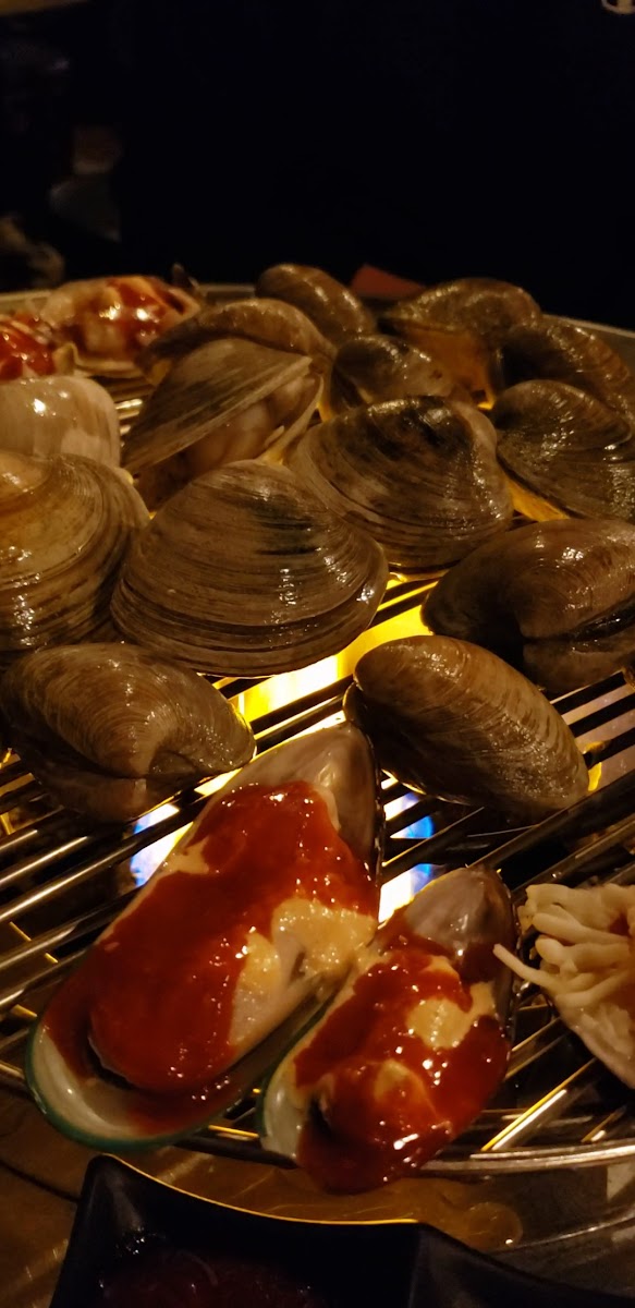 We had a fun time eating clams, scallops and shrimp from the table grill. Everything was fresh. We enjoyed steamed egg and beef soup and side dishes. These Spicy rice cake with ramen was tasty. Flame from the table makes you sweat, so you definitely need some cold drinks. It was a fun experience!